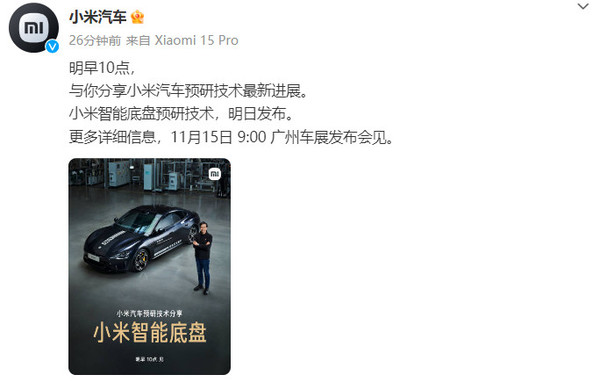 【CNMO科技消息】11月13日,欧博abg小米汽车官方宣布,明早(11月14日)10点,小米将分享小米汽车预研技术最新进展。小米智能底盘预研技术,将于明日发布。更多详细信息,欧博官网则将在11月15日 9:00广州车展发布会上揭晓。
